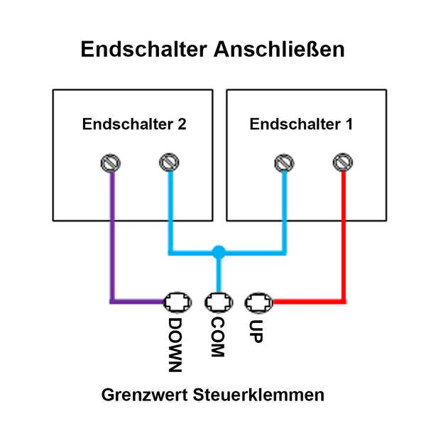 Sie können beispielsweise einen normalerweise geschlossenen Endschalter an die Klemmen <COM> und <UP> anschließen, und einen weiteren normalerweise geschlossenen Endschalter an die Klemmen <COM> und <DOWN> anschließen. Wenn sich der Motor in positiver Richtung dreht oder der Linearantrieb ausgefahren ist, wenn zwei Klemmen <COM> und <UP> getrennt sind, Motor oder Linearantrieb stoppt automatisch. Wenn sich der Motor in Umkehrrichtung dreht oder der Linearantrieb einfährt, wenn zwei Klemmen <COM> und <DOWN> getrennt sind, Motor oder Linearantrieb stoppt automatisch.
