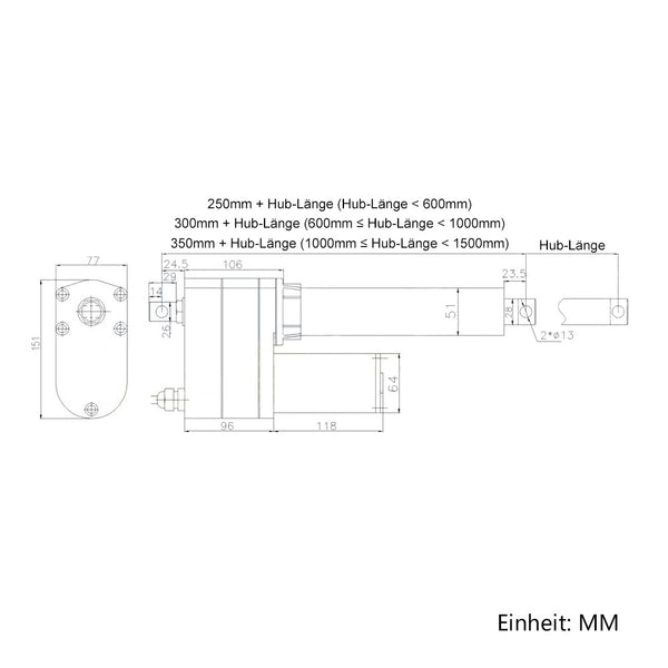Der Hubbereich von Linearantrieben beträgt 700 mm bis 2000 mm. Wir können jede Hublänge von 700 mm bis 2000 mm anpassen, z. B. 950 mm, 1250 mm, 1850 mm usw.