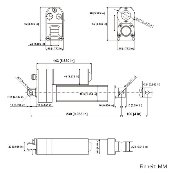Einzugslänge: Wenn der Linearantrieb vollständig eingefahren ist, beträgt der Mittenabstand zwischen den beiden Montagelöchern 230 mm.