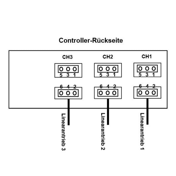 2) Wie in der Abbildung gezeigt, stecken Sie die zwei Klemmen von jedem der drei Linearantriebe in die zwei Anschlüsse der Kanäle CH1, CH2, und CH3 am Controller respektiv.