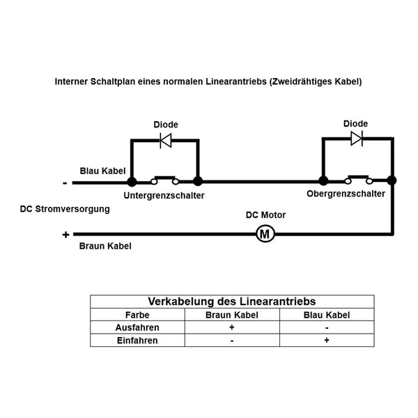 Der Linearantrieb verfügt über zwei eingebaute Endschalter. Wenn der Linearantrieb vollständig eingefahren oder ausgefahren ist, stoppt er automatisch.