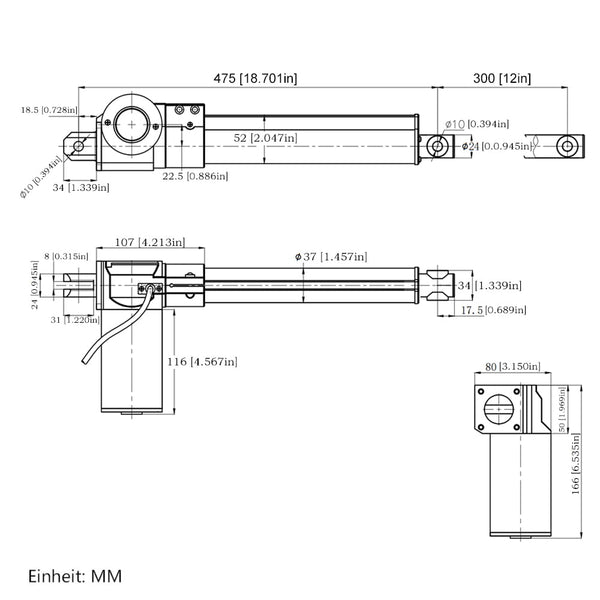 Einzugslänge: Wenn der Linearantrieb vollständig eingefahren ist, beträgt der Mittenabstand zwischen den beiden Montagelöchern 475 mm.